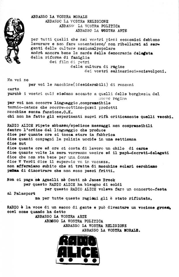 Quella sera, al Comunale, a lanciare i volantini, con gesto risorgimentale (vedi la citazione «W Verdi»), intabarrato in un pastrano, ci andò Bifo insieme a un gruppo di compagni, mentre Luciano, Enea, io stesso e alcuni altri della Radio andammo a casa della Silvia Zangheri (era ancora sindaco Renato) a una cena con Umberto Eco. Fu divertente! Comunicazione zero. Eco raccontava barzellette zozze ed Enea gli rispondeva con storielle zen assolutamente prive di senso comune. In quei giorni, eravamo di moda tra gli intellettuali della città: si parlava molto di noi, e cercavano di integrarci nel gioco dell'intellighenzia, ma noi gli rispondevamo «zut!»: «abbasso la vostra arte». L'unico gioco che potevamo accettare era quello della contrapposizione e infatti ce ne andammo dalla cena portando via i bicchieri di cristallo della bella Silvia.